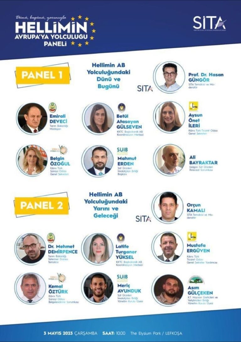 Kıbrıs Türk Siyasal ve Toplumsal Araştırmalar Merkezi’nden (SİTA) yapılan açıklamada, Başbakanlık AB Koordinasyon Merkezi, KKTC Tarım Bakanlığı, Kıbrıs Türk Ticaret Odası, Kıbrıs Türk Sanayi Odası, Süt İmalatçıları Birliği, Hayvan Üreticileri ve Yetiştiricileri Birliği temsilcilerinin yer alacağı ve arka arkaya gerçekleştirilecek 2 panel şeklinde organize edilen etkinlikte moderatörlük görevlerini SİTA adına Prof. Dr. Hasan Güngör ve Orçun Kamalı üstlenirken; Çiğdem Duvarcı da etkinlikte sunucu olarak görev alacak.